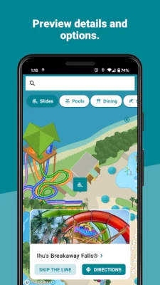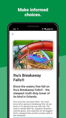 Does not provide correct estimates of slide times. For instance, some mid-week rides report a few minutes' wait, while the time in a very, very long line is approximately an hour. Unfortunately, this is the same issue as the Busch Garden's app for weekday rides times on some rides. Don't go into a five minute wait line expecting five or ten minutes unless you use general common sense for the time of day and activity level. Super unreliable.