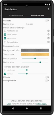Works great, highly customizable, and very helpful since my phone's buttons are not working. Also, most importantly, no ads! Many thanks for the developer. It also remembers the position you set it in both landscape and portrait mode! This is a wonderful app.