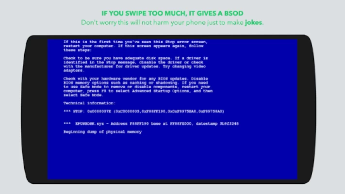 I selected option "I want BSOD". Tapped the screen several hundreds times, but BSOD screen haven't appeared. Liars.