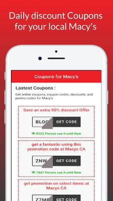 This app has it all for you A useful app where you will find many Coupons For macy's. Check out coupon for macy's digital coupons before you go shopping. This will help you save much more with discounts and great deals. Save your time and efforts in searching for specials discounts, deals, promos codes or digital coupons for macy's in many sources