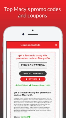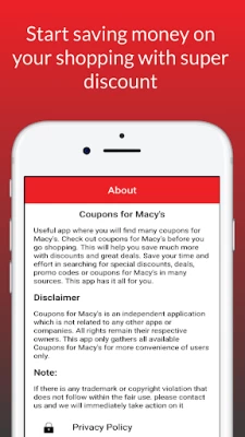 Coupons for macy's is an independent application which is not related to any other apps or companies. All rights remain their respective owners. This app only gathers all available Coupons for macy's for more convenience of users only.