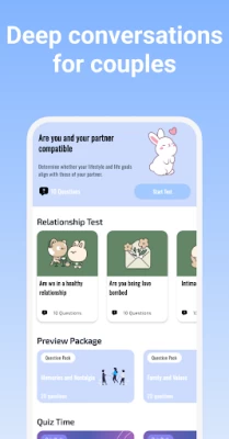 Deep Talks: Deep Questions is a couples questions app with meaningful question packs, icebreaker questions, and quizzes as conversation starters for couples. Our relationship app aims to assist you and your significant other in having stimulating and meaningful discussions.