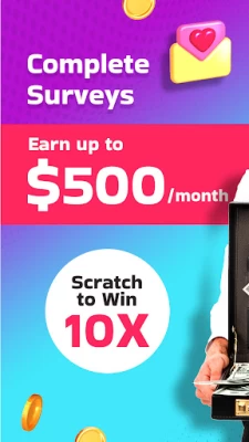 Earn real money. The app is great and the surveys are not hard. Yes, you will get kicked out if some, but still earn coins on some. It doesn't take along time to get cash built-up. Only draw back is, sometimes it takes 3 days to get the cash. Also, no ads!!