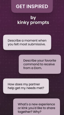 Great app, me and my Dom love it. Helps bring up hard topics and allows me to easily express my feelings to him, since verbal communication isn't really my strong suite. I'd love for them to continuing adding more interesting topics the recommended, some things can feel very genetic and repetitive. Other than that I love it, along with the obediance app I'm super happy with this!!
