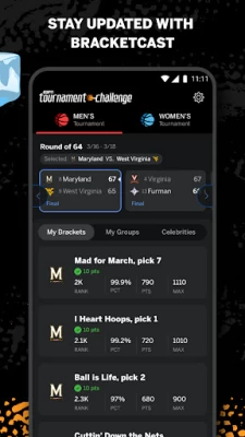 Buggy and non-intuitive layout. Couldn't view picks for games that hadn't occurred yet. Partially useless for keeping up with your bracket, it's 1 job. The worst part is the notifications. 2 settings, men's and women's tournament. Can't turn off the women's notifications. It's an app to send a notification every couple hours to watch ESPN.