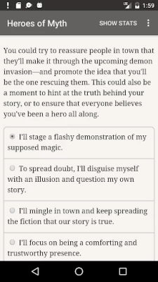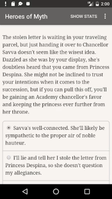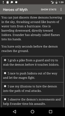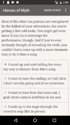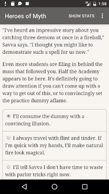 Wow, I love this game! I always loved to read and stories of witches, wizards, mages and magic were always my favorite. I've had a hard time the past several years and haven't read a whole book in years. Heroes of Myth has helped me rediscover my love of reading again! Heroes of Myth is an interactive story that allows the reader to choose the main characters next course of action! I recommend this if you love stories of magic and mysticism. The storyline is new, fun and an original! I love it!