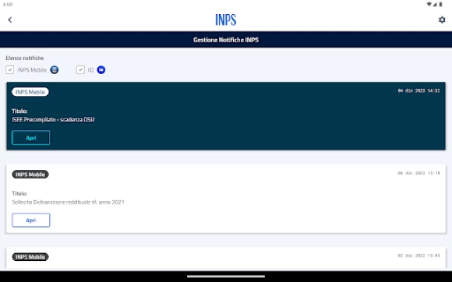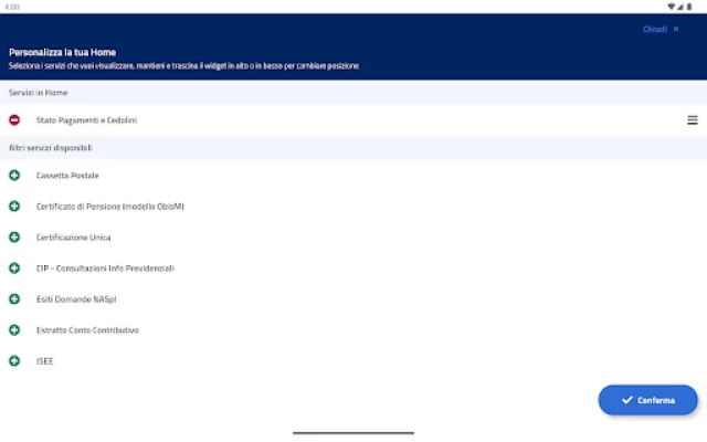 Servizi con autenticazione: Estratto Conto Contributivo; Cassetta Postale; Estratto Conto Datore lavoro domestico; Stato pratiche Gestione Dipendenti Pubblici; Pagamento Riscatti, Ricongiunzioni e Rendite; Pagamento Lavoratori Domestici; Cassetto Previdenziale Aziende; Consultazione Domande ANF Lavoratori Domestici; Esito Domande di Pensione; Consultazione Domande ANF Gestione Separata; Cedolino Pensione; Stato Domanda; Stato Pagamenti e Cedolini; INPS Risponde; Certificato di Pensione (modello ObisM); Certificazione Unica; Quota Cedibile; Consultazione Red Est; Gestione Notifiche; Esiti Domande Disoccupazione Agricola; La mia Pensione (Previsione per i lavoratori); Bonus Nido; Esiti Domande NASpI; Premio Nascita; CIP - Consultazione Info Previdenziali; Consultazione Domande ANF Pagamenti Diretti per Aziende; Consultazione Reddito/Pensione di Cittadinanza; Simulatore ISEE per Reddito/pensione di cittadinanza; Verifica Verbale Invalidità Civile; Gestione 730/4; Consultazione ISEE; Assegno unico e universale per i figli a carico; Lavoro Domestico; Durc OnLine