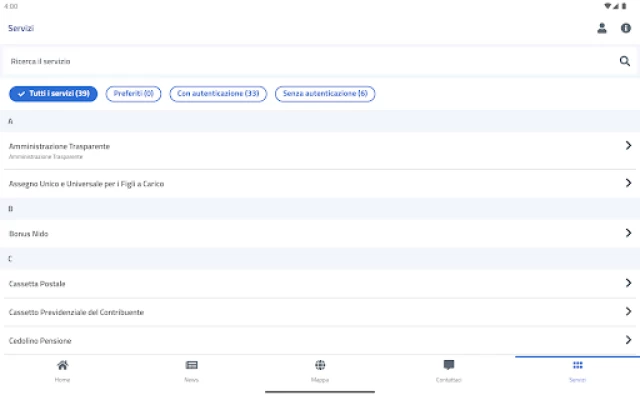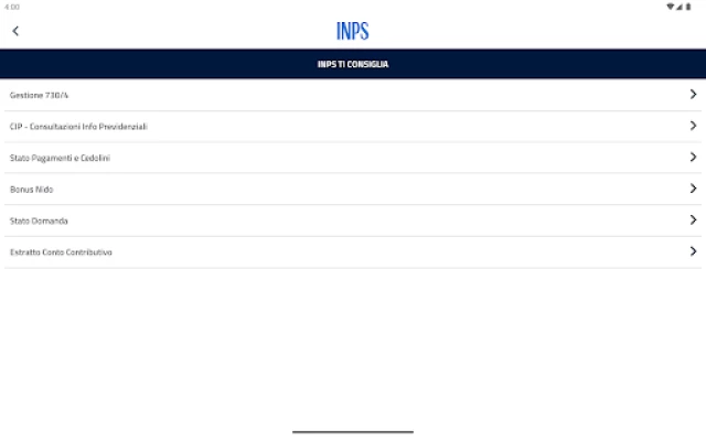L’utente può visualizzare l’elenco completo dei servizi disponibili anche senza inserire le credenziali richieste per una parte dei servizi disponibili nell’app INPS mobile.
