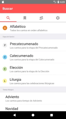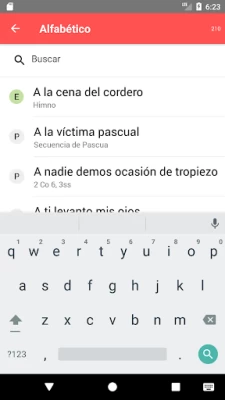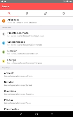 Dura demasiado para cargar los cantos. Cuando estoy en la lista buscando un canto, el scroll tiene que cargar cada cierto número de cantos. La lista es muy gruesa, si la ponen mas delgada, se ven mas cantos al mismo tiempo y facilita las cosas en ves de buscar mas arriba o mas abajo. Me gustó que al buscar palabras busque también dentro de los mismos cantos, eso facilita mucho las cosas.
