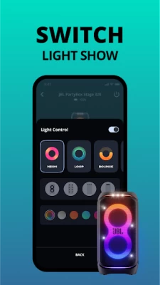 Very easy interface and twinning technology is a wonderful change. Big fan of JBL, I would like some download able content like some more special effects. Edit, the new update now allows app power on and twinning. Now I can have my speakers anywhere, for the best sound. Now I would just like the option for two light colors, of my choosing, to strobe. Like red and green, or any combo. It could match team colors or organization colors.