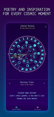 * Cosmic Clock: A beautiful cosmic clock greets you each time you open the app offering haiku poetry, insightful thoughts, and uplifting affirmations based on the current astrological alignments.