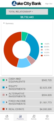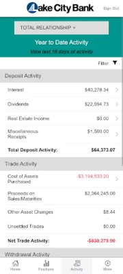 Convenient and secure access to your trust and investment information wherever you are with Lake City Bank Wealth Mobile. The application provides a snapshot of your total wealth, making it easy for you to share information with your trusted advisor, making informed financial decisions based on your goals.
