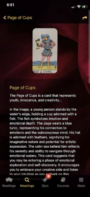 The app itself is great and its very easy to look up the meaning of specific cards. Im also a big fan of the daily quiz as it helps me remember card meanings! The only issue i have is the insane paywall put on the courses and quizes. i would do it for 5 bucks monthly but WEEKLY? I wish it was more accessible.