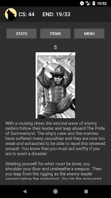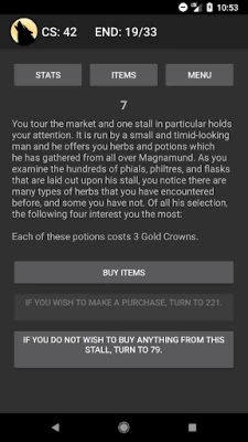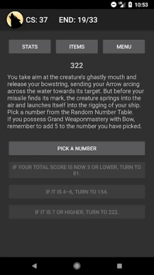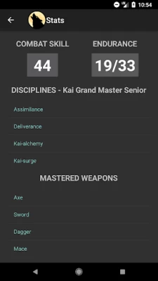 Outstanding effort! Never thought I could play this in my phone. Few recommendations: 1. Enable player to arrange the order of backpack and special items. 2. Allow player to decide when to utilise 10 EP from Curing and 20 EP from Deliverance. 3. Allow map to be dragged for easier view. 4. Upgrade map to mark up journey progress. 5. Allow item safekeeping at monastery like we did in Kai, Magnakai and Grand Master Adventures.