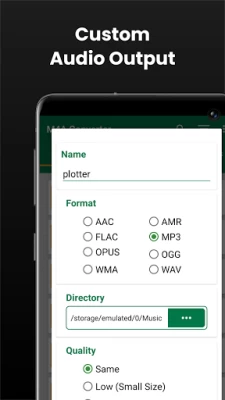 Really an excellent app with some major flaws. 1: It would help if there was a "select all" option for the tons of files in the chosen folder to convert. 2: No matter what i do it refuse to convert into the folder i chose for output directory on my SD Card. It only converts into my phone's internal Music Folder. Most of us have no space left there to convert numerous files. I watched 20 ads while only been able to convert 3 test files. Please fix it. Other than that it's really a great app! 👍