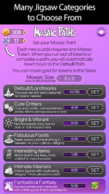 - Gallery - View your collection of completed Mosaics and replay your favorites in puzzles up to 144 pieces.