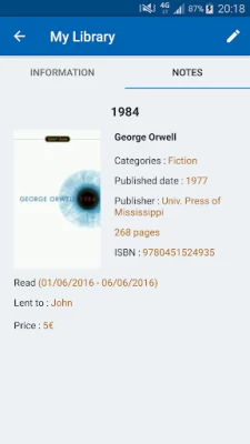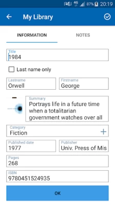 I LOVE THIS APP! I have been waiting for an app that can help me keep track of my ever growing library. and this app ticks off most of my needs. it's easy to use, has places to put everything from title and author to notes and publication info! I wish the automatic summery filler was more accurate. I do love the ability to take a picture of the summery and it auto populate, though It needs work to fill accurately. and I want a space for cover type and if its signed or 1st Edition.