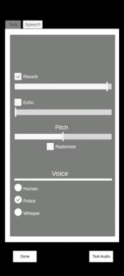 Sliding the power button over to "Speech" will turn on this unique mode of the app. Created to facilitate ghost box/ EVP like communication, the speech mode of the app provides audible spirit communication like no other. Generating speech sounds from within the app, there are no sound banks, word lists, radio, or any other pre-recorded audio. Spirits can use and manipulate these random speech sounds to form coherent messages, an idea rooted in ITC/EVP theory. Some of these messages may be heard in real time similar to a ghost box, other EVP-like communication can be heard on playback of the recorded audio. Again, the strength and level of communication being recieved depends on various factors. Coherent messages can only be obtained through communication with spirit, otherwise only unclear speech sounds will be heard.