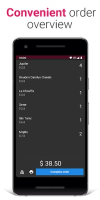 For a complete overview of the order, simply click on the "Checkout" button. This will show a list of all the ordered products, sorted by category. Once the order is completed, you can print a receipt and then click on "Complete order". This will save the order into the "Order history", where it will always be available.