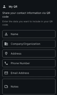 Effortlessly share your contact details. Use the "My QR" feature to create a personal QR code with your name, company, phone number, email, and address. Networking has never been easier!