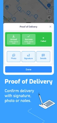 - Delivery-specific features like proof of delivery (photo, signature, notes, etc.).