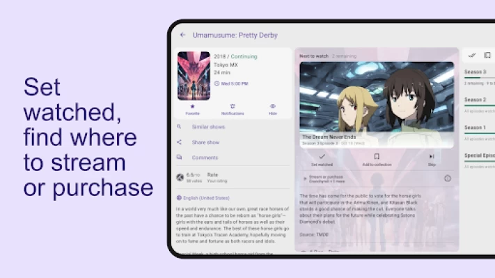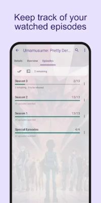 I love this app. It is easy to use, thorough and has practically everything. I wish instead of just saying X episodes remaining, it also showed the total number of episodes you HAVE watched Two features I love: That it even includes a section for special episodes outside the main seasons and that it pretty clearly denotes which episodes are parts of a crossover that has a related episode in another show. Can't recommend enough.