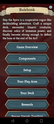 App is great, I love that you can access all rules and cards in the game and adding the soundtrack was a masterstroke. The save game option is kind of worthless unless the option of tracking each players deck and relics is added. Writing down that information as a "note" can take forever with just two players after act 1. I hope that's added in the future, but even if it isn't, this is a really helpful app.