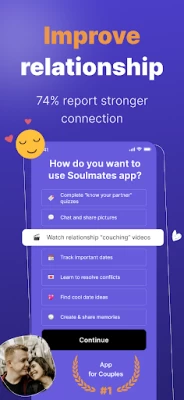 Soulmates is a new app for Couples. It helps you to have happier, healthier and longer lasting relationship. Know each other better, play couple games, get relationship advice, learn to manage conflict, and feel more connected than ever.