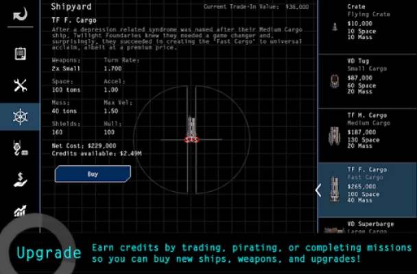 Far as mobile games are concerned it's a good entry into the genre, especially considering the price. Looks good plays smooth, core gameplay loop is interesting enough. There are some pretty big bugs, like inability to swap already equipped parts due to ship not having enough base space (Brawler Mk2) Need money? Sell ship for fast cargo and trade till afford VD cargo and upgrade shields/engine. 30mins of good trades will net you around 5mil. Just finished main arc, great game, worth a buy.