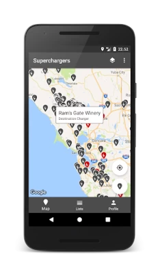 Works great to find superchargers. Gives address and local retail. Relies on user updates which includes photos. Especially useful if one is traveling in a new area. Something Tesla does not provide except in the car. Good job.