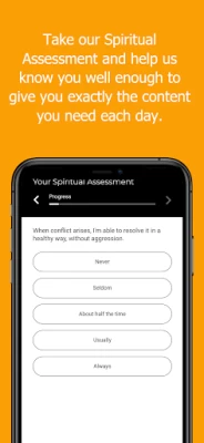 What you get: • Take a short spiritual growth assessment to trigger personalized messages custom-fit to you. • When life throws you a curve, use the Personalize My Verse Feed button to adjust your messages on-the-fly to reflect your current needs. • Read on your schedule. Set your content Reminders to receive scripture when YOU want it. • Save your favorite messages and private notes, as well as like and share any content via social media.