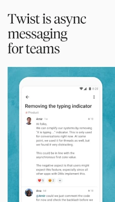 This has proven to be a decent communications tool for our organization. Not as constantly in-your-face as Slack, so if you need to be constantly poked, Slack is a better tool. For us, Twist is preferable because we need to work without forced interruptions, and we are disciplined enough to check the app periodically.