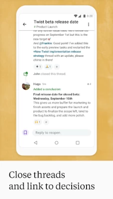 I have been using Twist for a few years, and the app has come a very long way! Notifications are consistent. The UI is very clean and easy to use. The only things preventing a 5 star rating is the bugs within the notifications. When I receive a message, I get a push notification and a bubble. Any attempt to reply or react causes the bubble to close. The push notification allows reading and replying but tapping it to enter the app causes the notification and the bubble to disappear.