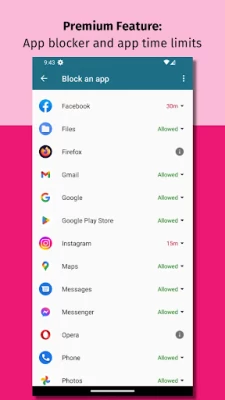 This is the app is perfect to break your smartphone addiction. I really like the self manage option for preventing app removal. I request the devs to do something similar for the boomerang app. I have purchased premium versions of both however I am not able to use boomerang properly as I only have this device. The pricing for manage SPIN is just right (any higher would reduce value) and I have been looking for something like this since a long time.