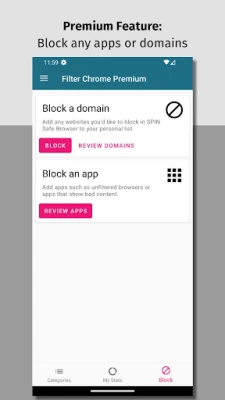 I love this app BUT 1. If you block (disallow) an app you can uninstall and reinstall it and the blocker is disabled. 2 You can still access porn sites through clicking a url on the twitter app. A browser opens within the app. Now although chrome pops us with a blocked message from Spin you can still toggle between twitter tab and blocked chrome and youll be able to access porn sited via twitter. These two issues are still a major flaw and would love to see them resolved