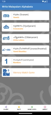 A Best app for Malayalam learners: It is an wonderful app for beginners who wished to learn Malayalam..... It is very much user friendly.... The advantage one can experience are: 1. It has pronunciation 2. A direction for how to write 3. Memory game 4. Absolutely free