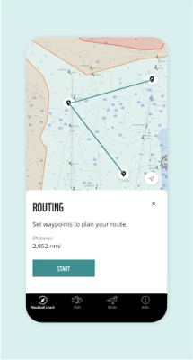 - Waypoints can be set with the routing function. The distance and course of the selected route are automatically displayed.