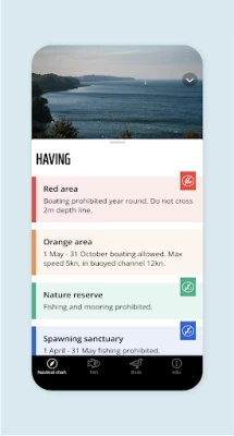 - Orange and red areas indicate when boating is permitted in the area or not.