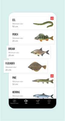 - Minimum sizes and seasons closed for fishing: during the season when fishing is not permitted for a species, a crossed-out fishhook appears next to the fish.