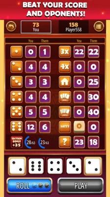 It's almost the best yatzee game by far if only they would make it to where you can log on with facebook and play friends and make it to where you can have different dice. If they did that it would be the best yatzee game out there.Atm your just verses bots and they cheat alot:( online just means bots cheat even more so not real ppl and they always have a number not an actual name. Please change this so we can login with facebook and play friends and add different dice and backgrounds.