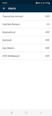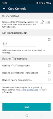 The card app works great. Gives me notifications whenever I use my card for charges or if someone stole my card number. I can set a limit to the amount that can be purchased on my card. You can also block your card from being used if lost, stolen or misplaced. Really fantastic app.