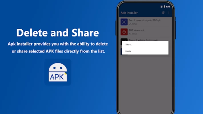 Delete and Share: On a long item click, Apk Installer provides you with the ability to delete unwanted APK files directly from the list. You can also share APK files with your friends or colleagues effortlessly, simplifying the process of app sharing.