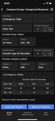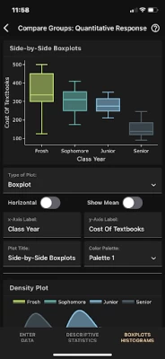 The Art of Stat: Explore Data app includes statistical methods for exploring categorical and quantitative data. Obtain summary statistics, contingency tables or correlation coefficients and generate bar- and pie charts, histograms, boxplots (including side-by-side boxplots), dotplots or interactive scatterplots that let you color dots by a third variable. Several example datasets are preloaded for you to explore (including instructions on the statistical analysis), but you can also enter your own data or import a CSV file.