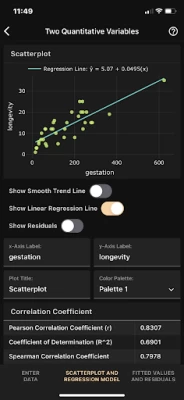 - Interactive scatterplots with regression lines to analyze the relationship between two quantitative variables. Correlation statistics and linear regression parameters and predictions. Plots of raw and studentized residuals.