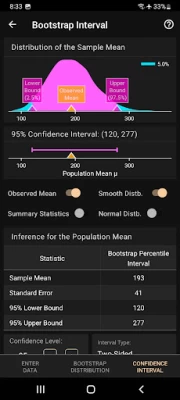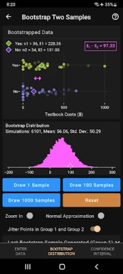 3) Obtain the Bootstrap Confidence Interval or Permutation P-value on the third screen, along with lots of supporting information and comparison to classical, central-limit-based inference.