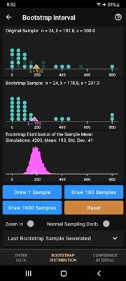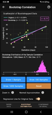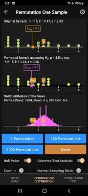 2) Generate the bootstrap or permutation distribution on the second screen, step-by-step, or 1,000 at a time.