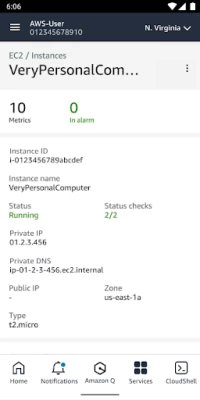 Overall decent app to monitor running instances and such. Doesn't have the ability to create new ones though. Loses a couple of stars for no fingerprint sign on option. Gets old constantly typing in username and password when other apps do fingerprint or other biometric sign in options. Constantly requires full sign in process. Annoying. Zero stars if possible.