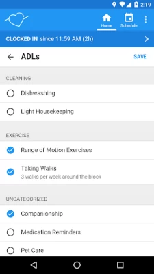 1) I'd love to see my monthly sched, not just a week's worth--other apps like Generations offer this. 2) I would like to see previous notes on my clients--Generations allows for this, and it's great! 3) If I make a mistake when requesting a shift, I can't undo it. I'd like to have the option so I don't have to call my already busy scheduler before she approves it. Things I love: being able to chart with each ADL., being able to edit/add notes in case I forgot for the next 24 hrs.