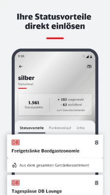 the app shows all information but to use the actual points, it's unintuitive and made so you cannot actually redeem them. For example, if you'd like to upgrade your ticket from 2nd class to 1st class for free, it sends you to the ticket search but only for 1st class tickets, so you cannot even buy the 2nd class ticket to upgrade. All of these points redeem features should exist within the db navigator app and not on some clunky app that is only there to make it more confusing for people. 1/5