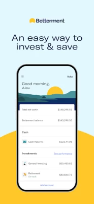 Betterment as a service is extremely simple, but to be honest I haven't seen any returns in 2 years of passive investing with an auto-adjusted portfolio. App itself is pretty good. Works for seeing an overview of your investments & making deposits/withdraws. Not great for adding/managing external accounts. No Robinhood support. No ability to transfer money between taxable and joint taxable accounts. Also very, very white. Please make a dark theme.